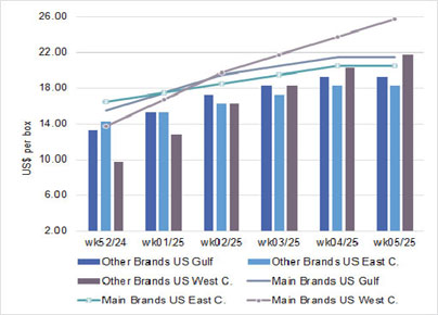 Read More »In week 40, banana selling prices in St. Petersburg ranged from USD 21.12 to USD 22.35 per box CIF, depending on the brand, volume, and packing. During the week approximately 1.28 million boxes were unloaded, and around 2.05 million boxes are expected to be unloaded for the upcoming week. The exchange rate for the USD was 81.01 RUB. In the Mediterranean, the price of Ecuadorian bananas ranged from USD 19.50 to USD 20.50 per box, CIF. In Northern Africa, prices peaked at USD 23.00 per box, CIF. In contrast, bananas from Central America were selling for approximately USD 21.00 per box, CIF.
